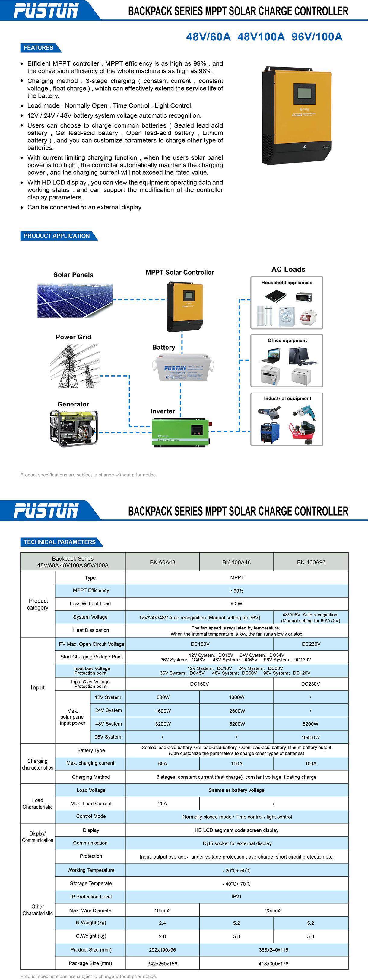 ● Charging method: 3-stage charging (constant current, constant voltage, float charge), which can effectively extend the service life of the battery.
