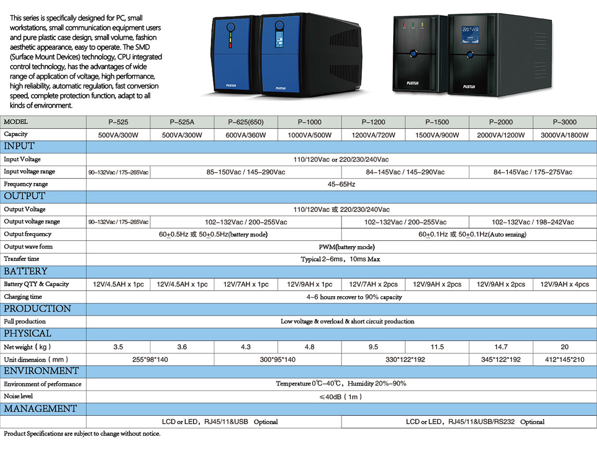 Standard cell series technical specifications ( PS Series, Standby, Line interactive L, Line interactive, Online high frequency, Online low frequency)